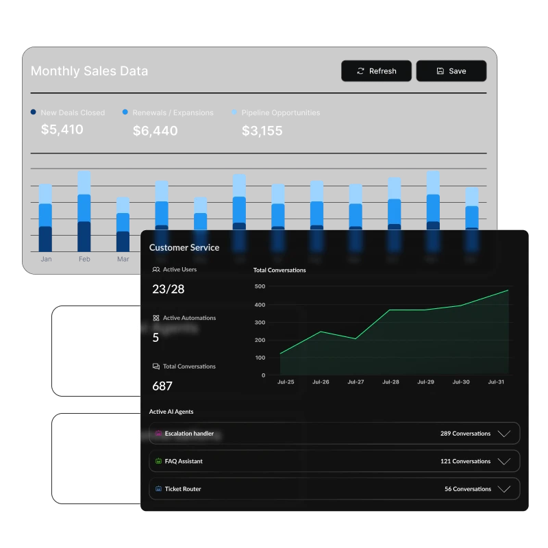 From your dashboard you'll see exactly what's running, how it's performing, and what it's costing. Iterate, pause, or add new agents as your needs grow — all with full control.